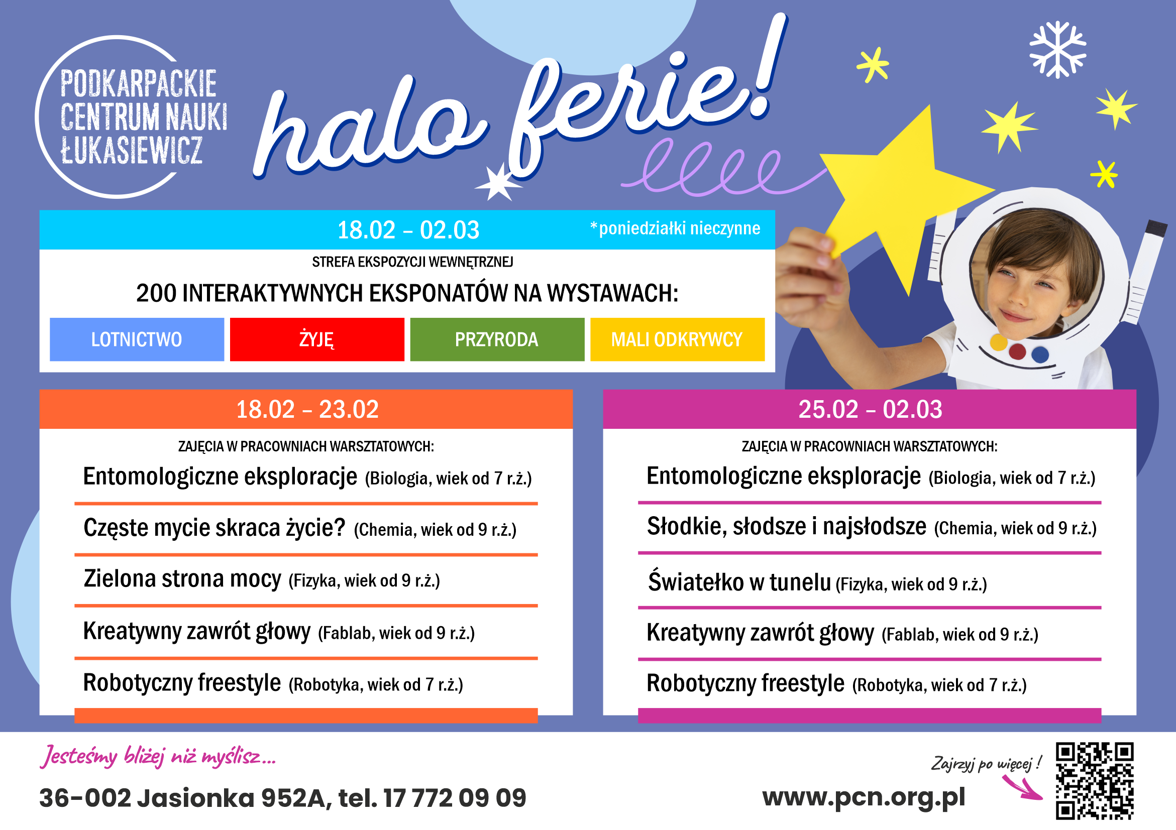 Podkarpackie Centrum Nauki (PCN) zaprasza organizatorów zimowego wypoczynku i wszystkie rodziny z dziećmi, które spędzają ferie na Podkarpaciu do wizyty i naukowych przygód. Centrum oferuje unikalne doświadczenia edukacyjne oraz rozrywkowe, które mogą wzbogacić program zimowych atrakcji dla dzieci i młodzieży. Oferujemy kompleksowy program edukacyjno-rozrywkowy, który sprawi, że Wasza kolonia, półkolonia czy wizyta indywidualna stanie się niezapomnianą przygodą z nauką.