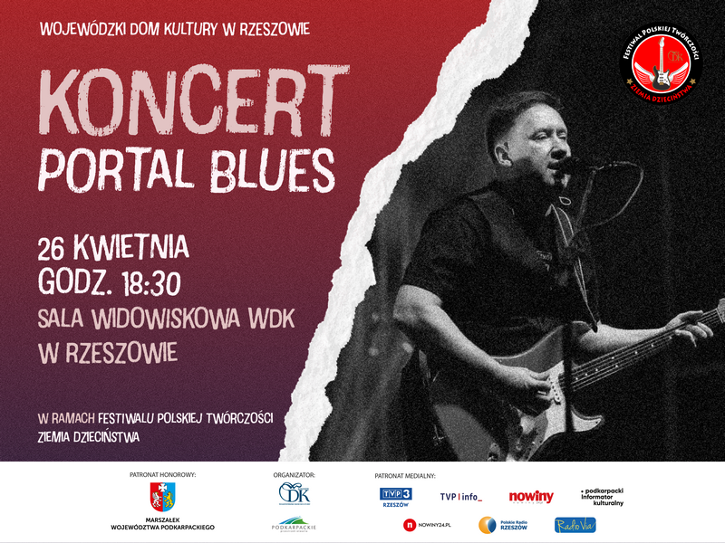 Wojewódzki Dom Kultury w Rzeszowie zaprasza na prawdziwie bluesową sobotę. Ma to być okazja, by posłuchać świetnej muzyki na żywo. Portal Blues, który zagra wieczorny koncert to sekstet znakomitych muzyków wykonujących od ponad 20 lat standardy bluesowe, evergreeny ze złotej ery rhythm blues’a. Koncert zaplanowany został początkowo na sobotę 26 kwietnia, jednak z uwagi, że dzień ten został ogłoszony dniem żałoby narodowej, wydarzenie zostaje przesunięte na sobotę 17 maja, godz. 22.00.