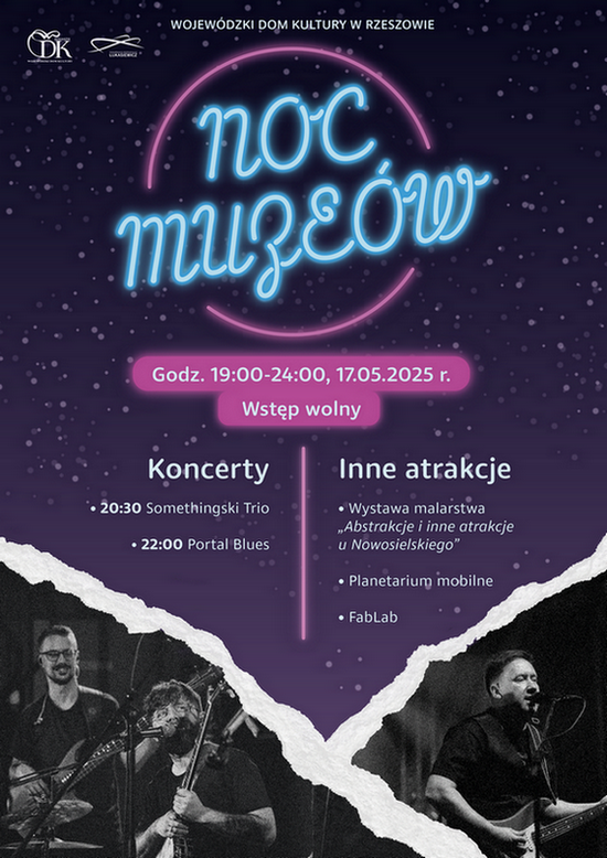 Pełną emocji Noc Muzeów szykuje Wojewódzki Dom Kultury w Rzeszowie. Gmach przy ul. Okrzei 7 zamieni się w przestrzeń pełną muzyki i kreatywnych przygód z nauką i sztuką. Plenerowy koncert pod gwiazdami zagra Somethingski Trio, a potem popłyną bluesowe evergreeny w wykonaniu Portal Blues. Będą kreatywne zajęcia, miecze świetlne i „płomienna” fala akustyczna, a nawet podróż w kosmos dzięki mobilnemu planetarium z Podkarpackiego Centrum Nauki „Łukasiewicz”. Zapraszamy w sobotę 17 maja, między 19.00 a 24.00. Zapraszamy! Wstęp wolny!